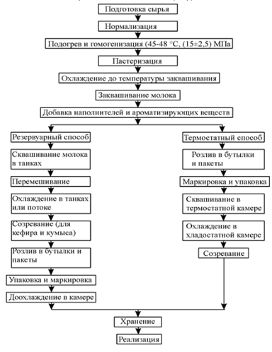В зависимости от способа организации процесса сквашивания смеси различают резервуарный и термостатный способы производства кисломолочных напитков. При резервуарном способе заквашивание, сквашивание молока, образование и формирование молочно-белкового сгустка происходят в одной и той же емкости. Затем сгусток с помощью насосов или самотеком подают на фасовку. При этом сгусток подвергается механическому воздействию, нарушается его структура, он становится более жидким. Однако при резервуарном способе производства улучшается использование производственных площадей; по сравнению с термостатным, в 1,5 раза увеличивается количество продукции, получаемой с 1 м2 производственной площади, в большей степени гарантируется однородность качества продукта по единицам упаковки, он получается более однородным по консистенции [11].