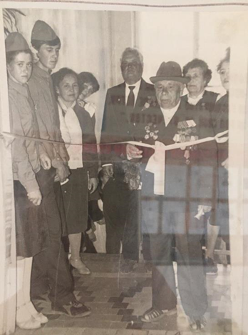 Рис. 9. Бирюков Петр Иванович (ветеран ВОВ, участник Парада Победы 1945 года на Красной Площади) открывает Зал боевой и трудовой Славы. Школьный архив.