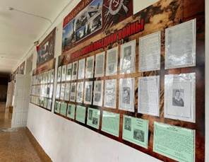 В настоящее время, в связи с тем, что количество обучающихся выше предполагаемой нагрузки в 2 раза, функционирует только Музей Боевой Славы [4]. Его экспозиции размещены на новых стендах. Собраны материалы о людях, прославляющих село в настоящее время. Музей насчитывает 80 стендов, 5000 экспонатов, более 100 альбомов (см. пр. рис.12-15). Наш музей широко известен в Ставропольском крае. Школа неоднократно принимала участие в конкурсах музейной работы и занимала призовые места, получала премии.