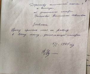Рис. 19. Заявление на работу в школу с. Винсады МБОУ СОШ № 9 (Семилетней школы 4) Валентины Ивановны Романенко (Униятовой). Школьный архив.