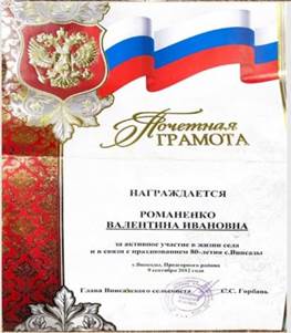 За сорок два года Романенко В.И., будучи учителем истории, воспитала немало учеников. Вместе с педагогическим коллективом Романенко В.И. делала всё, чтобы Винсадская школа была одной из лучших в Предгорном районе. Она была уважаемым человеком в селе Винсады, где я живу. Авторитет её был непререкаем. Преподаватели нашей школы с теплотой вспоминают Валентину Ивановну как наставника и хорошего, отзывчивого человека, который и на пенсии был частым гостем в школе.