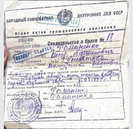 Рис. 32. Свидетельство о браке Валентины Ивановны и Петра Ефимовича. Архив семьи Романенко.