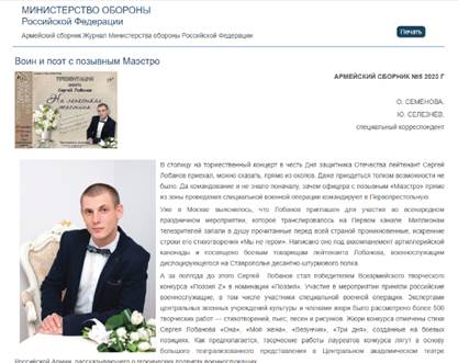 Появились и первые публикации в авторитетных газетах и журналах: «Литературная газета», «Литературная Россия», «Воин России», «Роман-газета», «Московский писатель», «Поэзия. Двадцать первый век Новой эры», «Рать», «Краснодар литературный», «Литературное Ставрополье», «Российский писатель», «День литературы», в общероссийских сборниках в поддержку СВО «Сила V правде!» (Минобороны России, 2022), «За други своя» (Союз писателей России, 2023), «Позывной – Россия!» (Псковское отделение Союза писателей России, 2023). «Воин и поэт с позывным Маэстро» статья в армейском сборнике (см.пр.рис.16) [5].