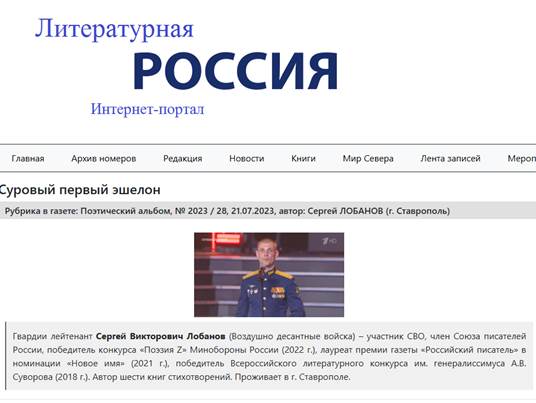 Вскоре после начала Специальной военной операции к Сергею Лобанову пришли и большие литературные победы: его фронтовую лирику высоко оценили (см.пр.рис.6).